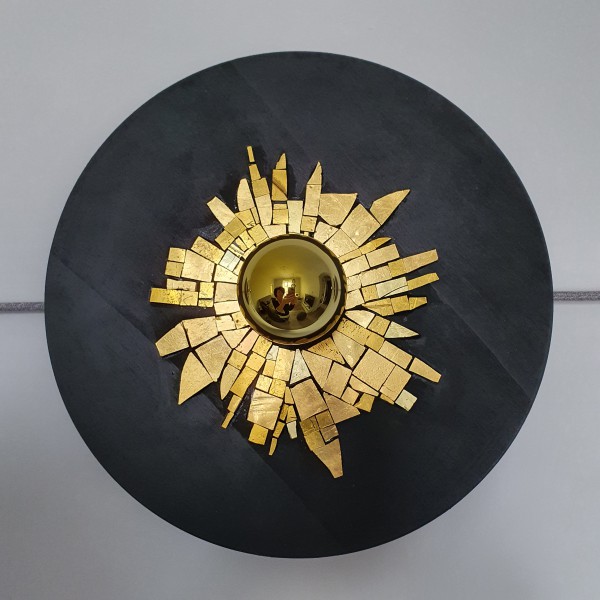 One by one, glass pieces, colored smalti tiles and gold or silver tiles, made from the Historical Venetian Furnace Orsoni, filled the crack of olive wood and give it a sensuous wavy movement.