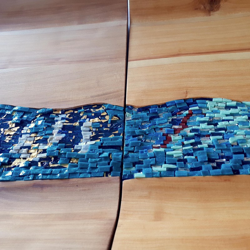 Two similar but different trays, modeled in hand-crafted cherry wood, with colored glass mosaic tiles and glass tiles with gold leaf from the historic Orsoni Furnace in Venice.