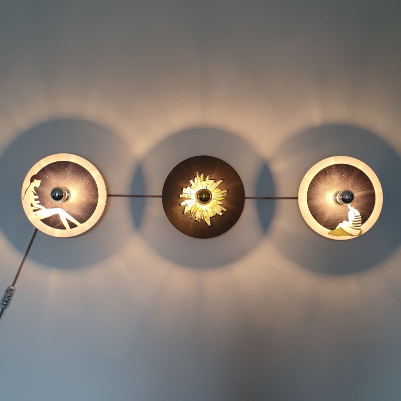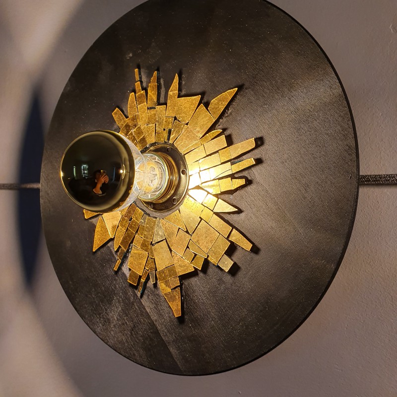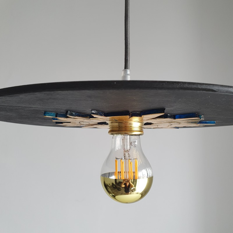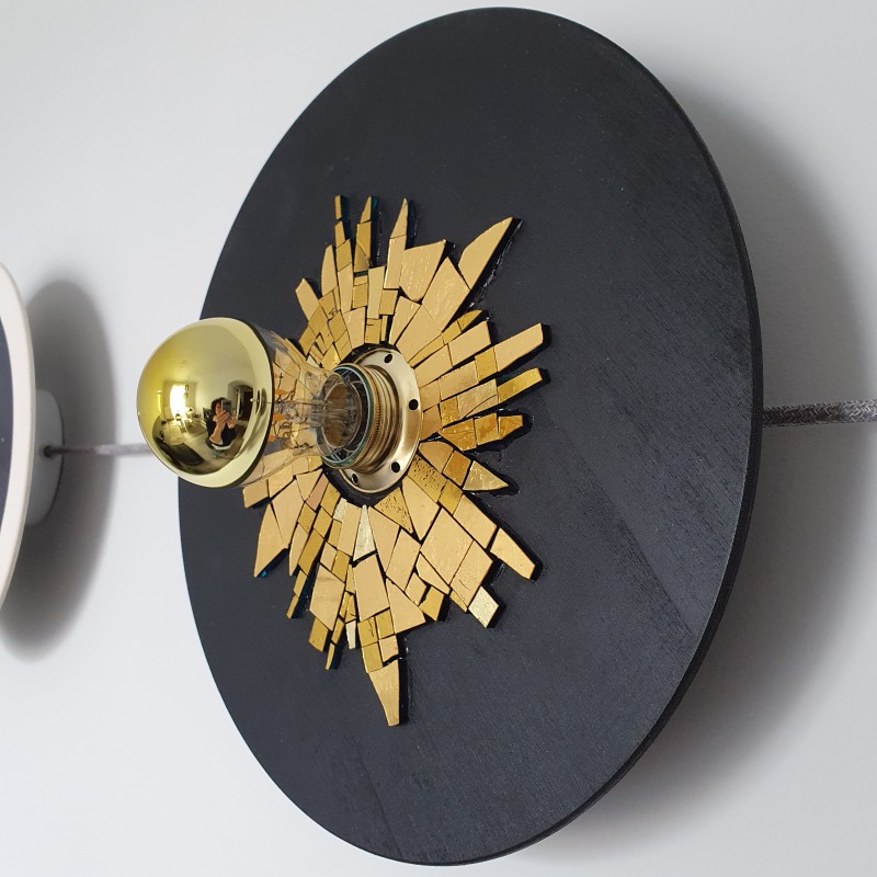 A support with lamp holder available on the website www.creative-cables.com, suitable for any bulb with an E27 fitting. I suggest you to choose an A60 Half Sphere LED bulb: the small bulb will not cover the mosaic work and the light will enhance it in an optimal way, without dazzling the observer.