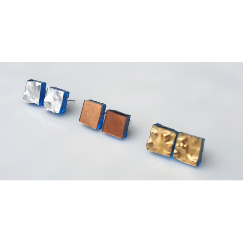 Bright as the reflections of the sun, these earrings are made with a very thin gold leaf placed on a blue transparent glass base and a very thin neutral glass to protect the surface of the leaf. Everything is welded by the fire of the oven, at a temperature of 1300 degrees in the historic Orsoni furnace in Venice.